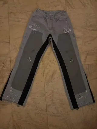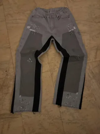 Pantalones de diseño único con detalles pintados. Gallery dept - Talla S-M. - Combinación de paneles grises y negros. - Bajo deshilachado.
