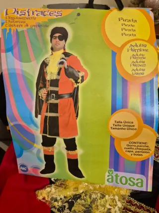 Disfraz de pirata para adulto, talla única. Perfecto para fiestas temáticas o carnaval. - Incluye gorro, parche, cuello, chaqueta, capa, pantalón y botas. - Marca: Atosa.
