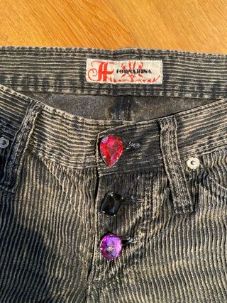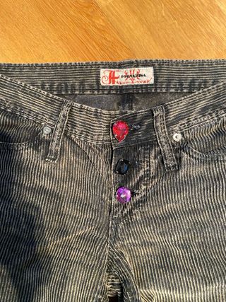 Pantalón de pana fina con un diseño moderno y detalles únicos. - Corte de moda. - Cierre con botones joya. - Tejido de pana con rayas verticales. En talla indica 28