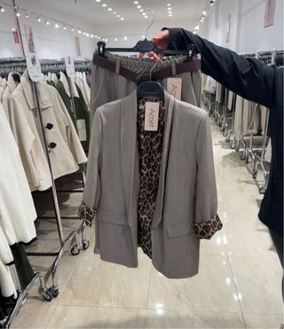 Elegante conjunto de dos piezas. - Blazer con forro estampado de leopardo. - Pantalón a juego con cinturón.