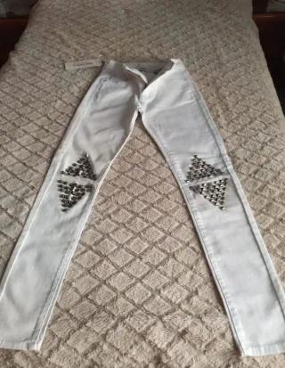 Pantalón vaquero de color blanco con un diseño único tipo pitillo Con aberturas en las rodillas - Tachuelas plateadas en forma de rombo en ambas piernas. - Corte ajustado. Talla 40 A ESTRENAR CON ETIQUETA ORIGINAL MUY SEXY AFINA SILUETA Se entrega en persona Visita mi página para ver otras ofertas