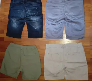 Pack bermudas azul y beige 1. Bermuda azul de tejido denim blando. Tela ligera y flexible, muy cómoda para verano. Talla 38, Marca Pull&Bear. 2. Bermuda beige de tejido tipo vaquero más grueso. Tela más rígida y resistente, color beige/caqui. Talla 13/14, Marca Seafor. Ambas prendas están como nuevas, apenas utilizadas.