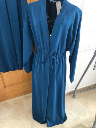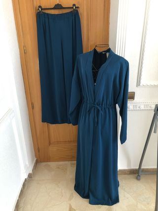 kimono + pantalon , en color azul petroleo , tambien disponible en azul marino como se ve en la ultima foto . pantalon cintura 39,5 sin estirar goma y estira hasta 49 cm, caderas 57,5 cm y largo 105 cm . kimono de sisa a sisa 54 cm y largo 141 cm