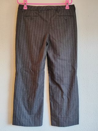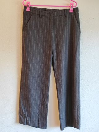 Pantalón azul marino a rayas verticales. De pinzas, ancho, con cinturón que se abrocha con hebilla y bolsillos laterales. El tejido es muy suave y agradable y tiene cuerpo; prenda otoño-invierno. Talla 42 Usado una única vez. Con unos tacones irás vestida; con deportivas, informal.