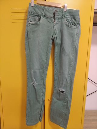 Pantalones vaqueros de color verde para mujer, talla pequeña. Son de estilo casual y tienen algunos detalles desgastados que le dan un toque único. - Tienen cierre de cremallera y botones. - Presentan rotos en la zona de las rodillas. - Son de tiro medio.