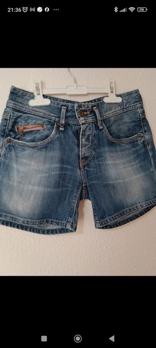 Preciosos shorts de la marca Pepe Jeans. Son de color azul y presentan un estilo desgastado que les da un toque único. - Bolsillo delantero con cremallera. - Cierre de botón y cremallera. - Talla no especificada en la imagen.
