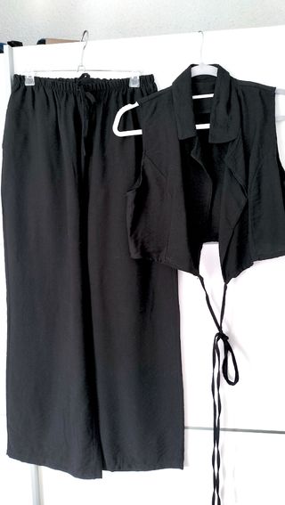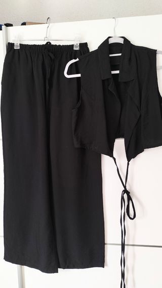 Preciosa y elegante conjunto de dos piezas en color negro. Ideal para cualquier ocasión. - Pantalón y chaleco corto con lazada en la cintura.
