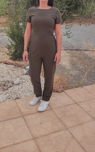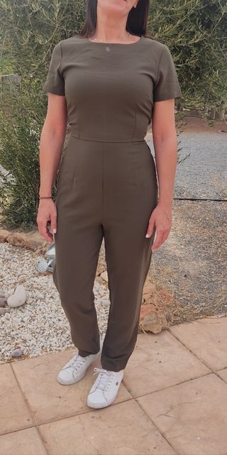 Mono de vestir en color verde kaki. Diseño elegante y moderno. - Manga corta. - Pantalón largo. - Cuello redondo.