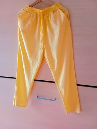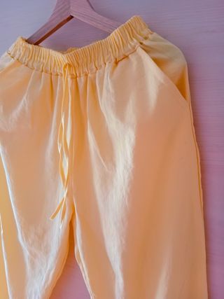 Pantalón ligero de color amarillo, ideal para la primavera. Es de tiro alto y tiene una cintura elástica con cordón. - Tejido suave y ligero. - Diseño sencillo y versátil. - Bolsillos laterales.