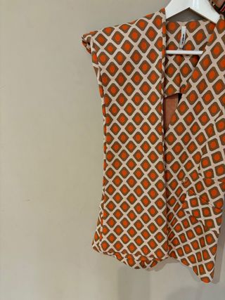 Pantalón de estilo vintage con un estampado geométrico. Su diseño acampanado le da un toque retro. - Estampado geométrico. - Corte acampanado. - Cintura elástica 34 cm, largo pierna 102, tiro 28. LAS DOS PRENDAS 10 euros. VER LA CAMISOLA EN PERFIL Y EN LA ÚLTIMA FOTO DE ESTE ANUNCIO.