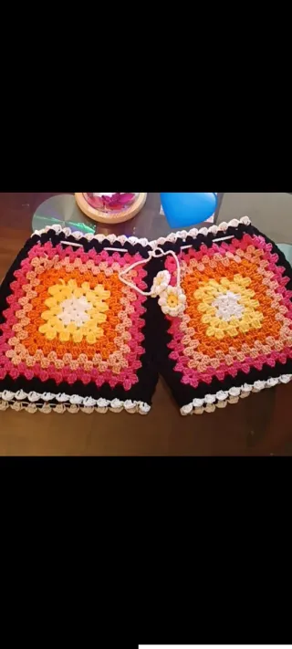 Shorts hechos a mano con un diseño de cuadrados. - Tejido de ganchillo. - Detalle de flores en la parte delantera. - Borde festoneado.