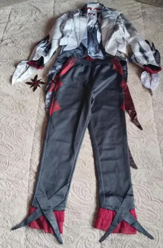 Disfraz de payaso con detalles llamativos. - Diseño con mangas rojas brillantes. - Pantalón y chaqueta negra. - Incluye detalles de volantes en muñecas y tobillos.