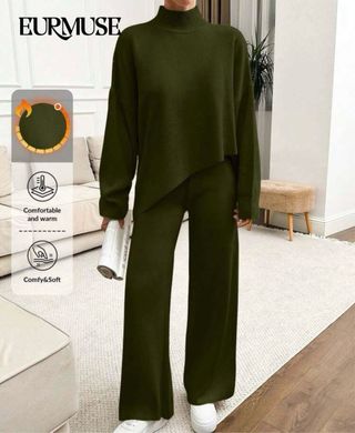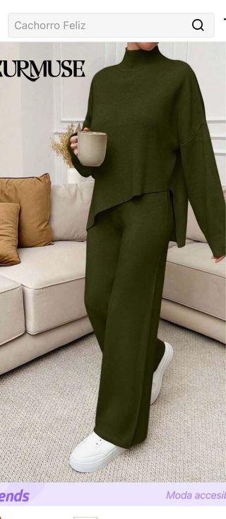 Conjunto de dos piezas para mujer. - Jersey de cuello alto con diseño asimétrico. - Pantalón de pierna ancha. - Tejido cómodo y cálido. - Sin estrenar