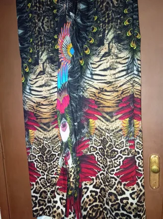 Pantalón con un llamativo estampado animal print que combina varios motivos de animales y plumas. - Talla única - Diseño de cintura elástica. - Estampado vibrante y detallado. - Corte amplio y fluido. Sin estrenar con etiqueta