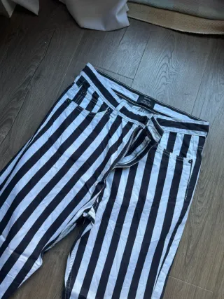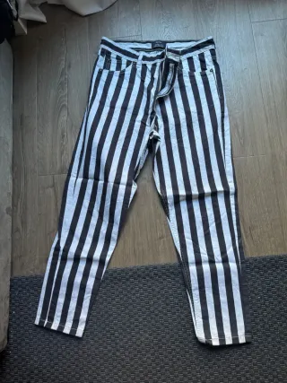 Pantalones más ceñidos y ajustados, sobre todo en la parte inferior, con estampado a rayas o líneas en colores blanco y negro de la marca Bershka. Fueron utilizados únicamente en una ocasión, así que están en perfecto estado y casi sin uso. Talla 40. Perfectos para un look, algo más divertido o para ocasiones especiales. El envío se hace muy rápido y precio muy rebajado. #bershka #pantalonesarayas #rayas #pantalonesbershka #bettlejuice