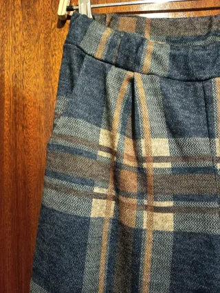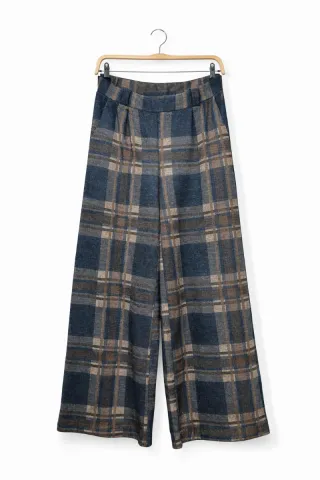 Pantalón ancho con estampado de cuadros muy versátil. - Diseño de cuadros en tonos azules y marrones. - Cintura elástica para mayor comodidad. - Piernas anchas y fluidas. - Tiene bolsillos