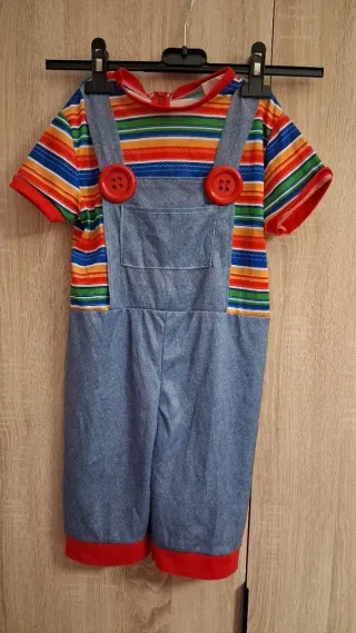 Disfraz infantil con camiseta de rayas multicolores y peto vaquero. - Camiseta de manga corta con cuello redondo. - Peto con tirantes y dos botones rojos grandes. - Ribete rojo en los bajos del pantalón.