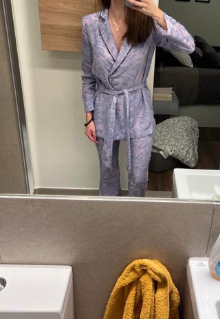 Conjunto de dos piezas de Lady Pipa en color lavanda. - Chaqueta con solapa y cinturón. - Pantalón de pierna ancha.