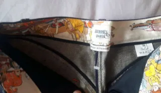 Pantalón de la prestigiosa marca Hermès con un diseño único. - Estampado de caballos y carruajes en el interior de la cintura. - Detalle de etiqueta Hermès Paris y Made in France. - Talla 36 (equivalente a S). - Composición: 100% Lino. Pre io en tienda 2000€
