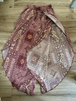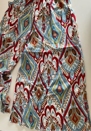 Pantalón largo con un diseño estampado muy llamativo. - Estampado tipo patchwork con motivos geométricos y florales. - Cintura elástica para mayor comodidad. - Piernas anchas y fluidas con abertura lateral. Está en muy buen estado, tiene aperturas laterales. Es muy fresquito, la tela buena. Me lo he puesto una vez.