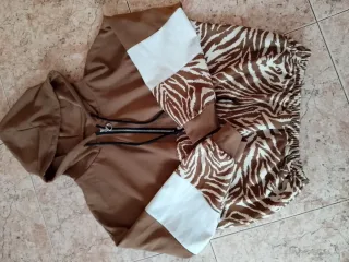 Conjunto deportivo con un diseño llamativo. - Sudadera con capucha y cremallera. - Mangas con estampado de cebra y detalles blancos. - Pantalón con cintura elástica y estampado de cebra.