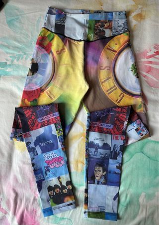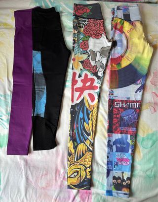 Conjunto de cuatro leggings deportivos con diseños variados. - Legging morado liso. - Legging negro con detalles de malla y estampado geométrico. - Legging con estampado de calavera, rosas y caracteres japoneses. - Legging con collage de portadas de discos de vinilo y grupos musicales.