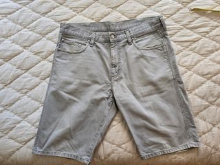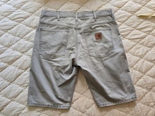 Pantalones cortos Carhartt de color gris. Son de un tejido resistente y tienen un aspecto desgastado que les da un toque único. - Bolsillos funcionales. - Cierre de botón y cremallera. - Talla (especificar talla)