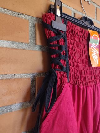Pantalón harem de la marca Coline, en color rojo y talla única. Es una prenda llamativa y cómoda. Precio en tienda:25€ Recoger en Loranca, Fuenlabrada o envío solo por wallapop. - Diseño único con detalles coloridos. - Cintura elástica con cordones. - Puños elásticos en los tobillos. - Bolsillos laterales.