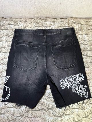 Shorts vaqueros negros de Bershka con un diseño único en gran estado. - Estilo desgastado con rotos. - Detalle de graffiti blanco. - Bajo deshilachado.