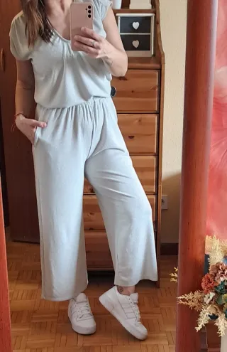 Conjunto Cásual Valentina súper cómodo y muy estiloso. En color Gris con hilo Lurex plateado. Camiseta en manga corta de sisa con fruncido en los hombros,corte fluído y relajado. Pantalón con pernera ancha estilo culotte,corte relajado y fluído. Talla M. Un sólo uso únicamente.