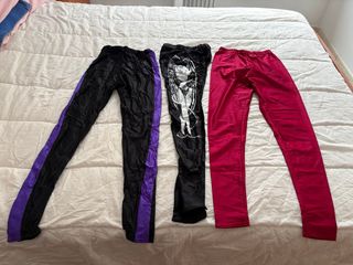 Conjunto de mallas, corpiños y pantalones de licra. - 2 Mallas negras raya morada y 1 raya blanca. 1 malla blanca. 2 negras con raya roja y 1 con dibujo estampado. -1 Pantalón corto negro. 2 cortos hasta rodilla raya roja. 1 corto raya blanca -Pantalones rosas. -2 Corpiños