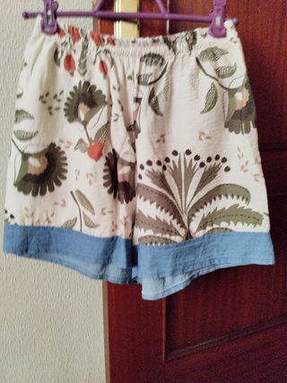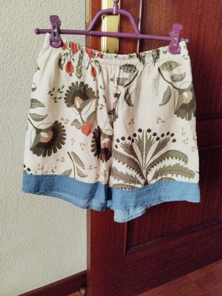 Pantalón corto de verano con un bonito estampado floral y un detalle de tela vaquera en el bajo. - Cintura elástica. - Diseño floral en tonos beige y verde.