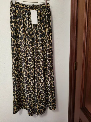 Pantalón fluido con un llamativo estampado de leopardo. Su diseño ligero lo hace ideal para cualquier ocasión. - Cintura elástica para mayor comodidad. - Corte ancho y vaporoso.