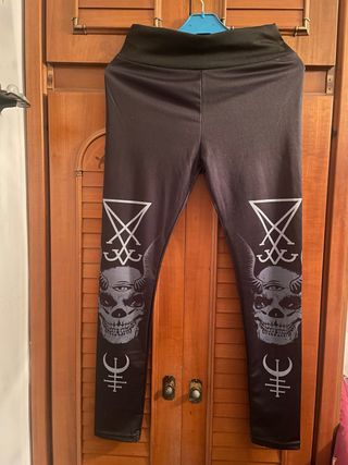 Leggings con un diseño gótico llamativo. Presentan calaveras y símbolos en tonos plateados sobre fondo negro. - Diseño de calaveras y símbolos. - Estampado plateado. - Talla unica. - Usados un par de veces.