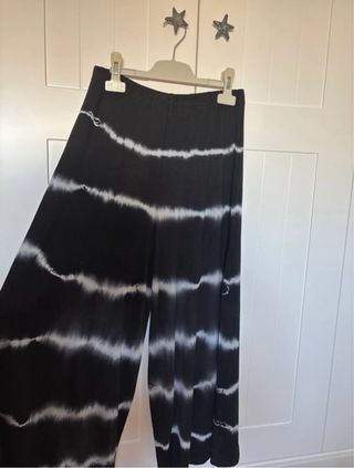 Preciosa conjunto de dos piezas: top corto y pantalón acampanado. El diseño de lunares blancos y negros le da un toque elegante y divertido. Es de talla única, hasta una 40. - Top con nudo delantero. - Pantalón de tiro alto. - Tejido elastico suave y ligero.