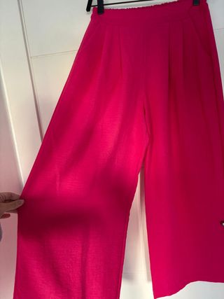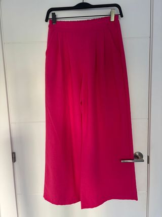 Pantalones rosas plisados, con goma en la cintura. Muy cómodos, ligeramente elásticos. Talla única, al ser la cintura elástica da prácticamente hasta 120cms de cintura. Puestos una sola vez, en perfecto estado. Ver fotos. Hago envíos y combino gastos si me compras varias cosas.