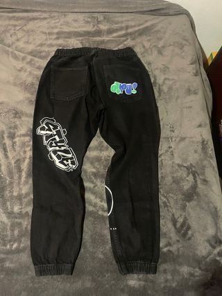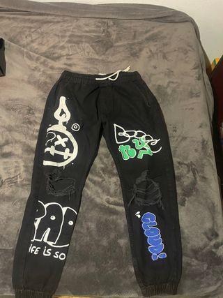 Pantalones tipo jogger con un diseño único y moderno. - Estampados gráficos en blanco, verde y azul. - Detalles rasgados en las rodillas. - Cintura con cordón ajustable. - Talla M Han sido usados solamente 2 veces. PRECIO NEGOCIABLE.