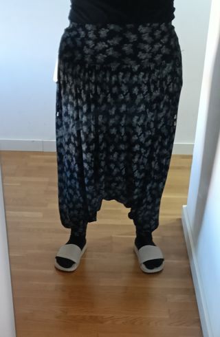 Pantalón estilo turco con un estampado llamativo. - Diseño con estampado floral en tonos negros y grises. - Corte holgado y cómodo. - Talla única adaptable.