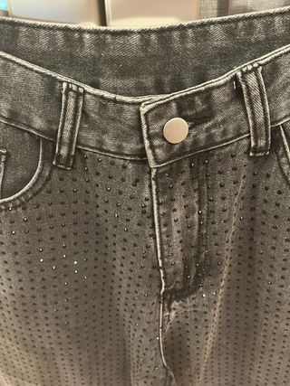 Pantalón vaquero de Bershka con un diseño único y detalles como brillos. Solo se ha usado una vez, está prácticamente nuevo. - Decoración de brillos plateados a lo largo de las perneras. - Corte recto y moderno. - Cierre de botón y cremallera.