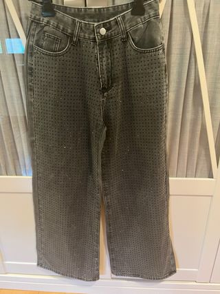 Pantalón vaquero de corte moderno con un diseño único. - Detalle de pequeños brillos incrustados por toda la tela. - Cintura con trabillas para cinturón y cierre de botón y cremallera.