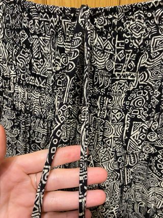 Pantalones largos con estampado étnico. - Cintura elástica. - Diseño holgado y cómodo. - Estampado abstracto en blanco y negro.