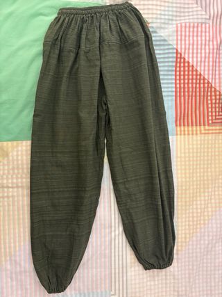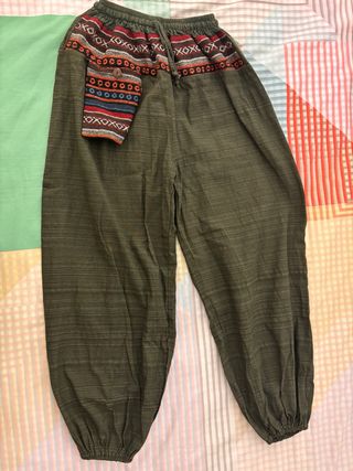 Pantalón ligero de color verde botella, ideal para el verano. Presenta un diseño con estampado étnico en la cintura y detalles en las perneras. - Cintura con goma. - Estampado geométrico en la parte superior. - Perneras amplias con puño elástico. - Bolsillo frontal.