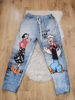 Pantalón jogger de mujer con un divertido estampado de Popeye y Olivia. - Diseño tipo denim azul. - Cintura con cordón ajustable. - Estampado de personajes de dibujos animados. - Talla única. Llega hasta una 46