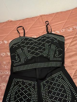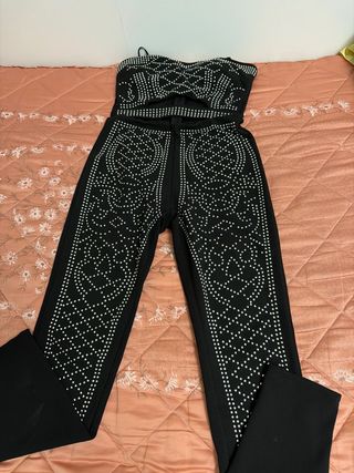 Elegante mono negro perfecto para fiestas y eventos especiales. Destaca por su diseño con pedrería. - Diseño strapless con escote. - Abertura en el abdomen. - Pantalón largo. - Adornos de pedrería en top y perneras.