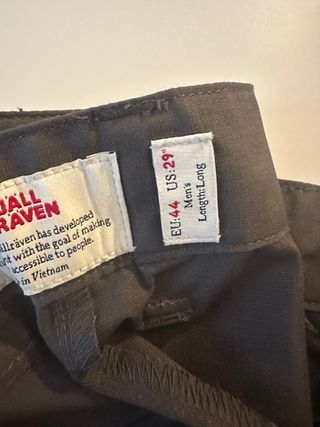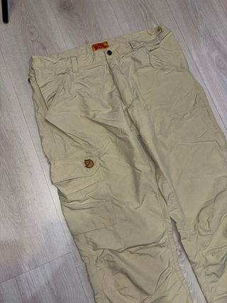 Pantalones de trekking Fjällräven con tejido G-1000. - Cinturón integrado con hebilla. - Múltiples bolsillos cargo con botones. - Parche con logo en el muslo izquierdo. - Detalle de logo G-1000 en el bolsillo derecho. - Talla 29" o EU 44