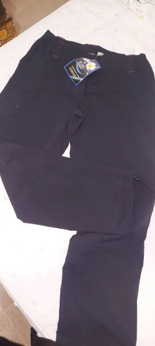A estrenar. Pantalón de trekking para mujer, ideal para actividades al aire libre. - Tejido resistente y cómodo. - Diseño funcional con varios bolsillos. - Cintura ajustable para un mejor ajuste. - Costuras en contraste color fucsia.