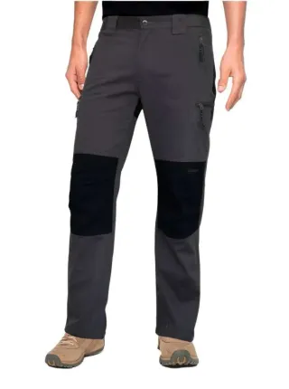 Pantalón hombre de algodón elástico de trekking. Gris oscuro / negro. Bolsillos laterales con cremalleras. Refuerzo en las rodillas. Ideal para el trabajo o actividades al aire libre. Marca de excelente calidad. Disponible en otras tallas. Precio original: 39,90€