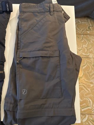Pantalones de trekking Fjällräven en color gris. Diseñados para la comodidad y durabilidad en actividades al aire libre. - Bolsillo cargo con cremallera. - Logo de la marca bordado. - Talla 29" o EU 44
