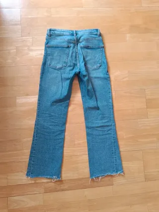 - Un pantalón vaquero de color azul claro de Zara bootcut de pierna corta, 67 cm de pierna por el interior. Talla 32 aunque talla para una 34. - Un jeggin color crema de Tezenis.Talla S. Muy cómodo. Los dos en buen estado, poco uso.