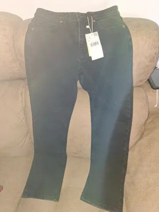 Pantalón vaquero de Bershka. - Corte bootcut. - Cierre de botones. - Bolsillos delanteros y traseros. La talla es pequeña en realidad sería una 34. No pudimos devolver en tienda porque se pasó el plazo. Original y sin estrenar.
